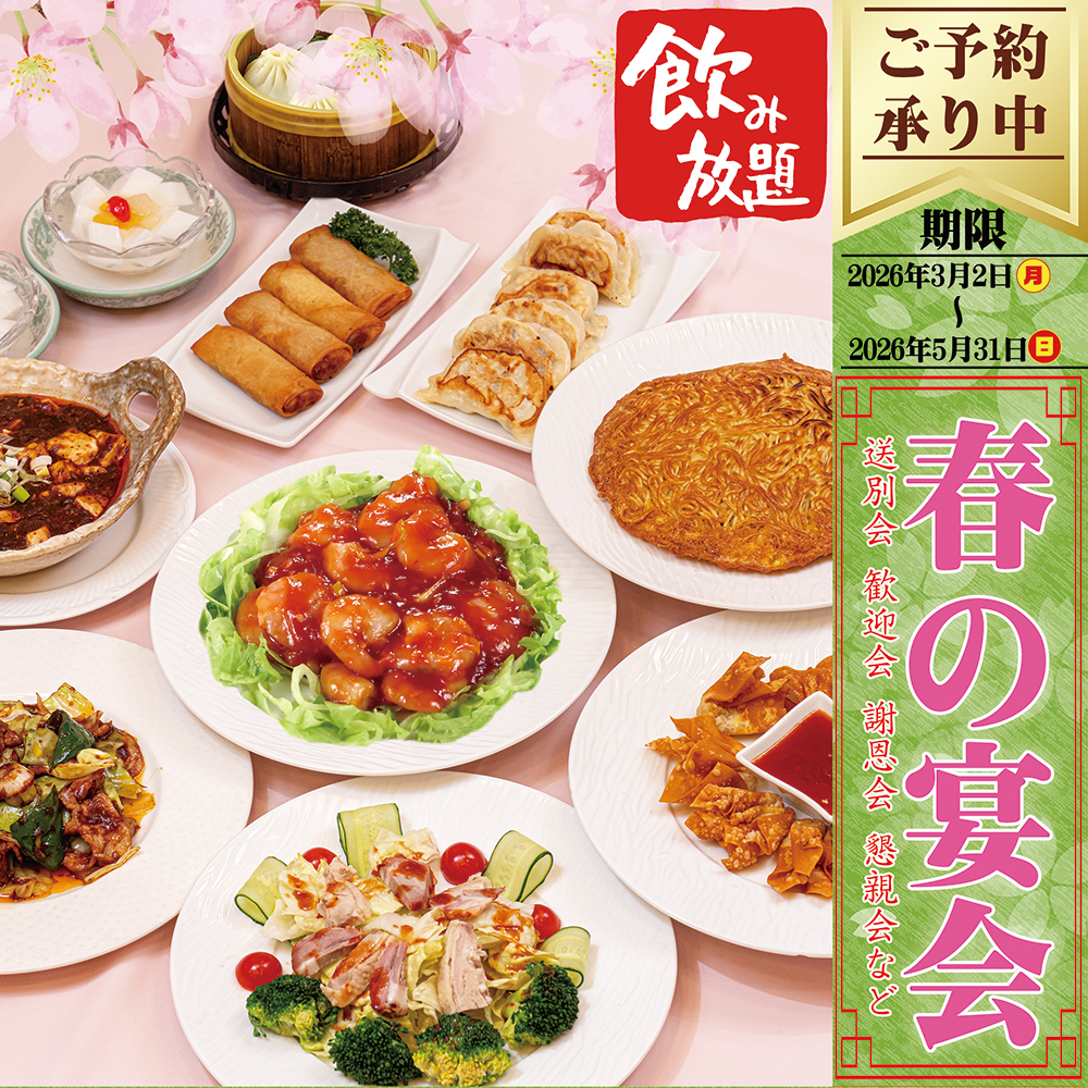 | 「エビチリ」や「麻婆豆腐」などの定番メニューに加え、当店の名物料理「梅蘭焼きそば」などを含む全10品+2時間飲み放題が付いた今だけのお得なコース内容になっております。送別会・歓迎会・各種宴会などにご利用くださいませ。 |